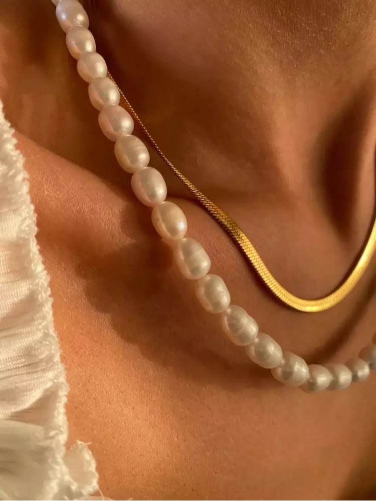 Classic pearl necklace with smooth, lustrous white pearls, creating an elegant and timeless look. Perfect for any formal occasion or as a chic accessory to complement casual outfits.