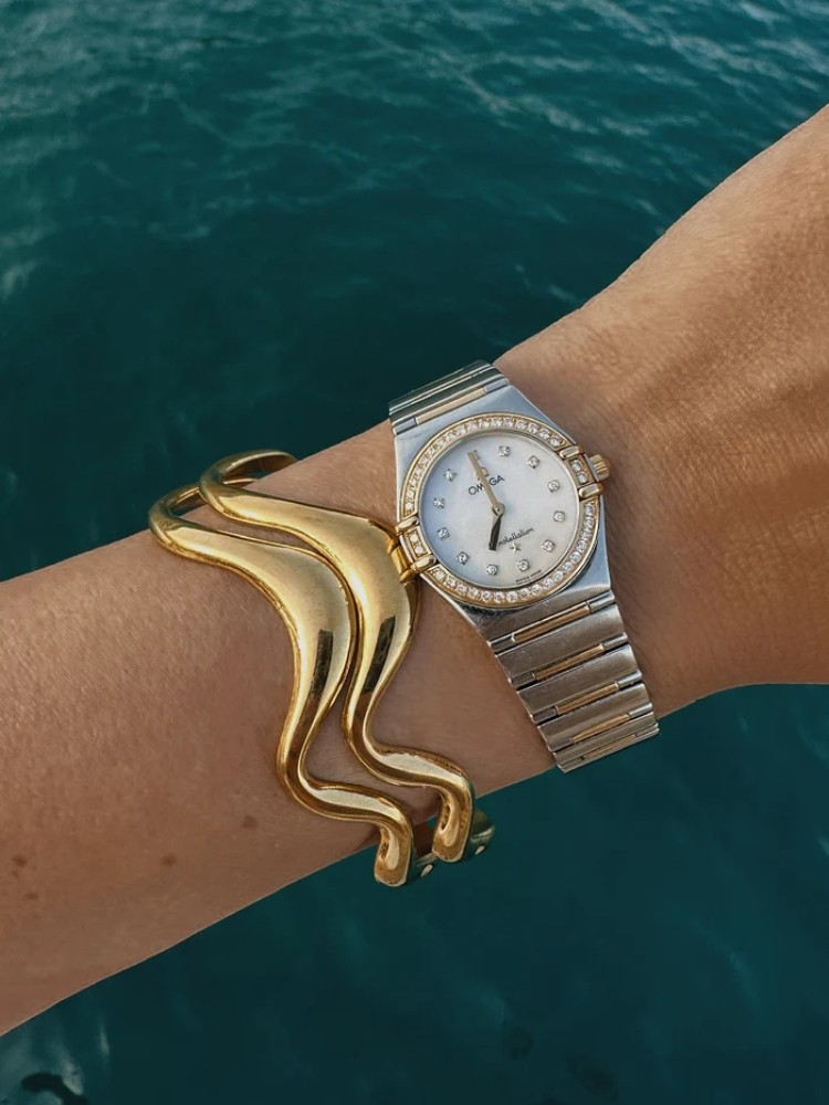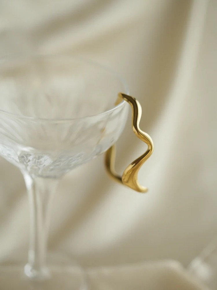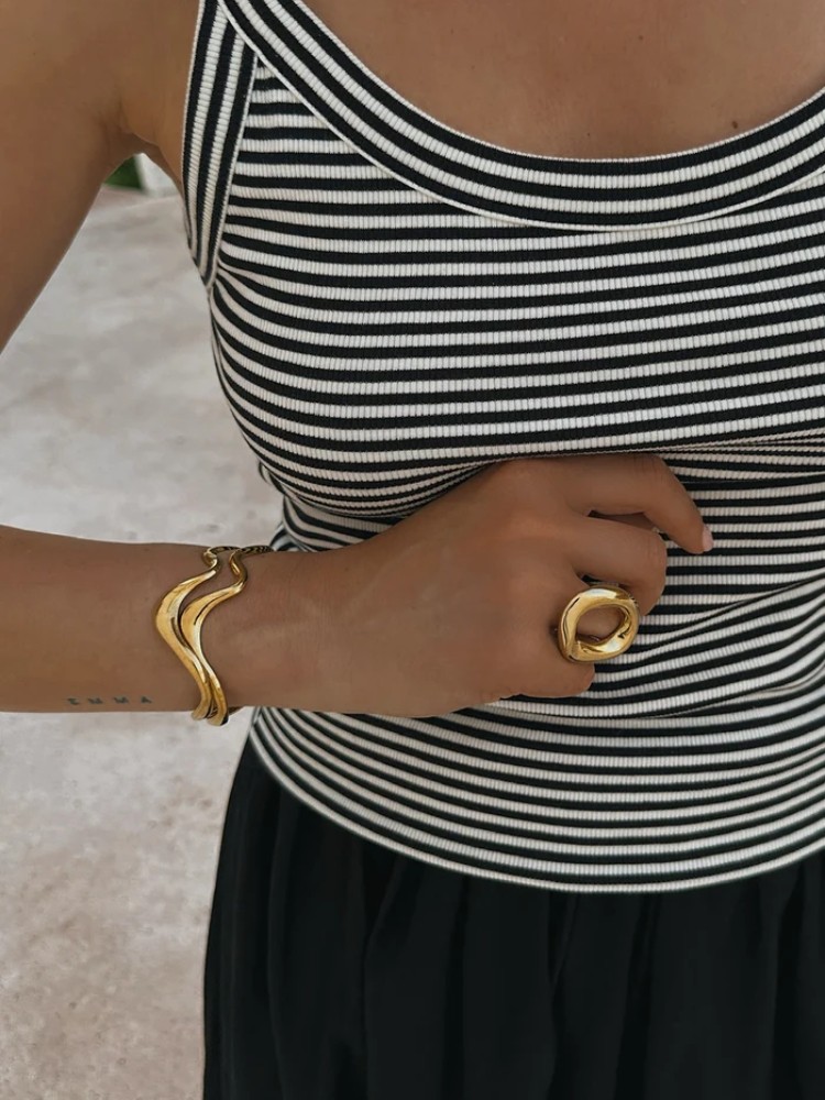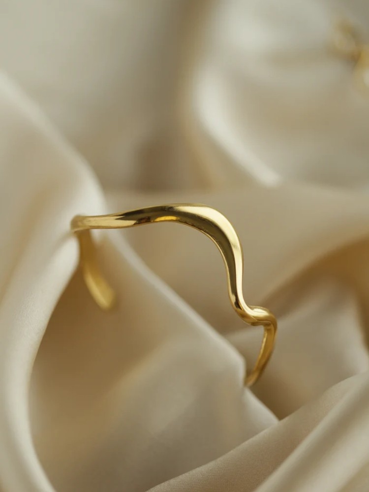 Gold-tone stainless ring with open oval design and matching abstract wavy cuff bracelet.