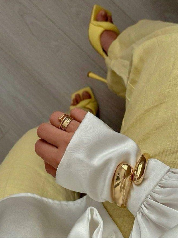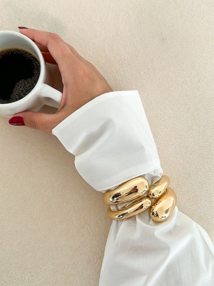 A pair of smooth, shiny gold-tone bangles with a modern, oversized design, offering a bold and contemporary look.